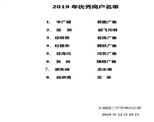市場決定凡被評為優(yōu)秀商戶、文明商戶的商戶,市場統(tǒng)一發(fā)放牌匾及禮品,并上傳至廣告網(wǎng)站,以后在媒體報道,市場廣告投放及網(wǎng)站宣傳,市場優(yōu)惠政策等方面享有優(yōu)先權(quán)。大家一起努力,希望我們市場的每戶都是文明商戶、優(yōu)秀商戶!