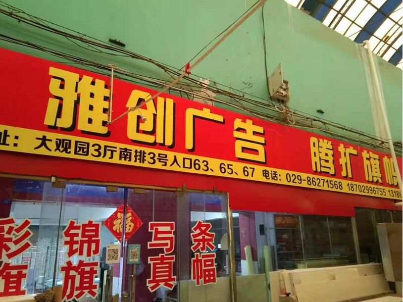 西安大觀園彩印標(biāo)牌市場,西安印刷廠,西安印刷包裝,西安廣告公司雅創(chuàng)廣告和騰擴旗幟廣告集旗幟制作、設(shè)計、經(jīng)銷于一體,專業(yè)經(jīng)營各類旗幟及旗幟耗材、輔料、配件。服務(wù)好、種類多、檔次高、規(guī)格全。